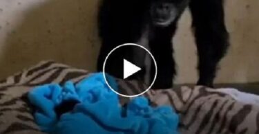 Animaux Un chimpanzé réagit en voyant son bébé pour la première fois après une césarienne. 10 juin 2023
