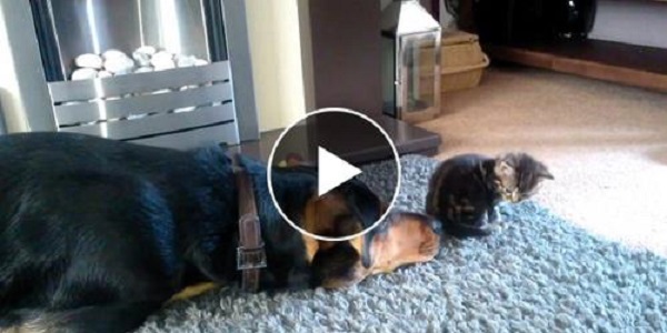 Petit chaton mignon, je veux être ton ami”, c’est ce que nous entendons en regardant ce magnifique chien allongé sur le tapis. Ses yeux de chiot expriment clairement son désir de conquérir le petit chaton qui, quant à lui, semble plus intéressé par sa séance de toilettage.
