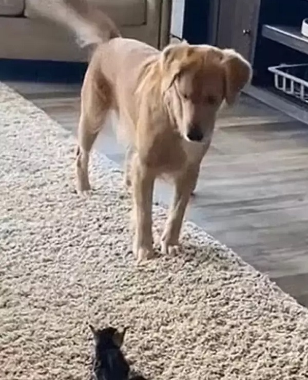 Lucy, plutôt anxieuse lors de cette rencontre inattendue, ne sait pas trop comment se comporter avec ce petit être adorable. Elle essaie de le caresser avec sa patte, mais elle change rapidement d’avis et s’éloigne. La courte séquence montre ensuite la chienne nerveuse tourner autour du chaton en attendant qu’il fasse le premier pas. Mais elle finit par se fatiguer et se couche sur le tapis, à quelques mètres de là.