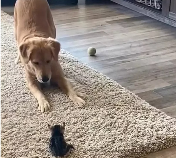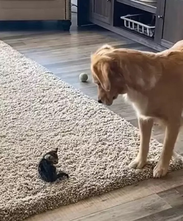 La responsable de cette surcharge de tendresse est Katie Squibb, une jeune femme de 25 ans originaire de l’Idaho. Alors qu’elle était chez ses parents, elle a capturé le moment où sa chienne Lucy rencontre Joey, un chaton de secours de 4 semaines. La vidéo démarre avec le chaton confortablement installé sur un tapis, au milieu de la pièce, fixant intensément le Golden Retriever. Cependant, le chien ne semble pas très ravi de partager son espace, voire même l’attention de ses parents avec quelqu’un d’autre.