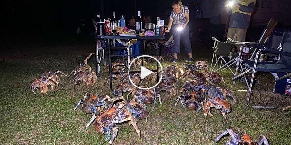 Alors qu’ils profitaient d’un grand pique-nique sur cette île exotique, une bande de crabes cocotiers a décidé de s’incruster dans la fête.