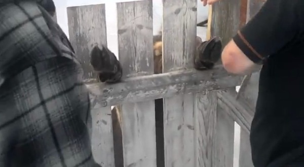 Voici une histoire de sauvetage animalier qui ne se produit pas tous les jours ! Lorsqu’ils ont été informés qu’un animal était en détresse, un groupe d’hommes s’est rapidement dirigé vers le côté d’une maison où ils ont aperçu deux sabots dépassant de la clôture.