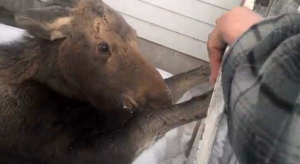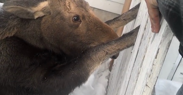 À leur grande surprise, il s’agissait d’un bébé élan, coincé et visiblement choqué. Le pauvre petit avait tenté de sauter par-dessus une barrière en bois, mais ses sabots avant s’étaient retrouvés piégés entre les lattes.