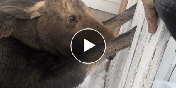À leur grande surprise, il s’agissait d’un bébé élan, coincé et visiblement choqué. Le pauvre petit avait tenté de sauter par-dessus une barrière en bois, mais ses sabots avant s’étaient retrouvés piégés entre les lattes.