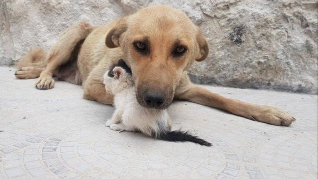 Junior, un chaton orphelin, a été recueilli dans un refuge pour chats errants et adopté par une chienne nommée Amira, qui vit dans les environs du refuge pour chats errants appelé Il Gattaro d’Alep en Syrie.