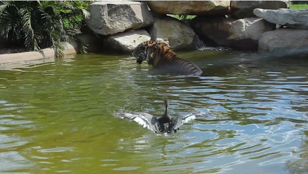 Ce canard sauvage est sans aucun doute le plus courageux, voire le plus intrépide, à avoir jamais existé. Il a décidé de se lancer dans le jeu le plus dangereux de Marco Polo avec Jalur, un imposant tigre de Sumatra pesant 126 kg, dans le bassin de l’abri réservé aux tigres. C’est une véritable démonstration d’audace !