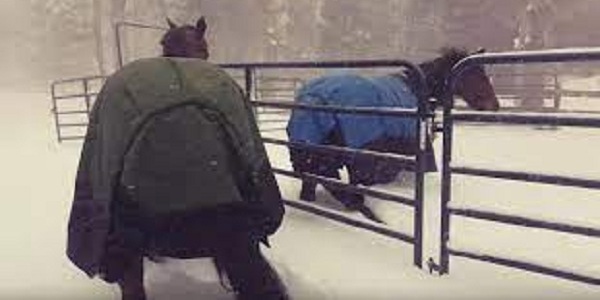 Alors que leur humain pensait qu’une sortie et de l’exercice leur feraient du bien, les chevaux ont prouvé le contraire en restant obstinément dans leur écurie. Vêtus de manteaux chauds pour se protéger du froid, ils ont fait quelques pas dans la neige avant de changer brusquement d’avis.