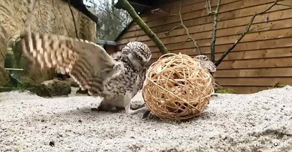 Les chouettes des terriers ne prennent jamais un moment de repos dans la volière. Au contraire, elles volent, courent et jouent entre elles sans arrêt dans leur espace. Ces oiseaux ont même des jouets comme une balle en bambou et de petits cailloux avec lesquels ils s’amusent.