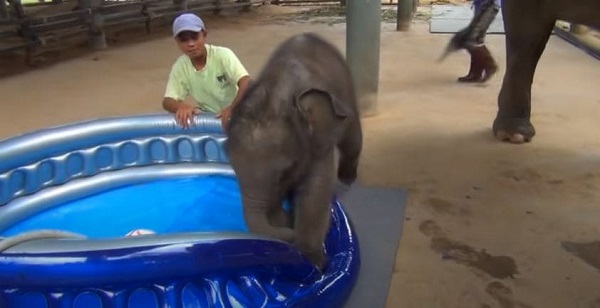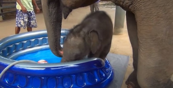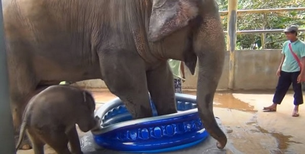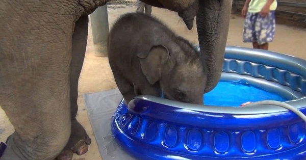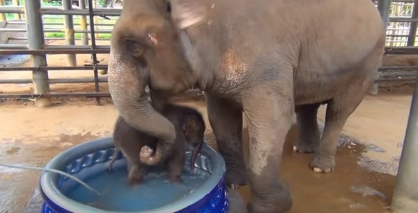 Dans la vidéo, vous pouvez voir la mère éléphant instruire son petit pour prendre son premier bain. Bien qu’elle soit d’abord gênée, l’éléphanteau réussit à entrer dans sa « piscine » et apprécie son bain.